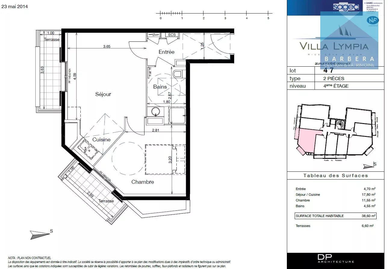 L'appartement s'articule autour d'une entrée de 4,70 m², d'un séjour-cuisine de 17,80 m² ouvert sur une première terrasse exposée sud, et d'une chambre de 11,55 m² disposant de sa propre terrasse exposée sud-ouest. La salle de bain de 4,55 m² complète parfaitement l'ensemble.